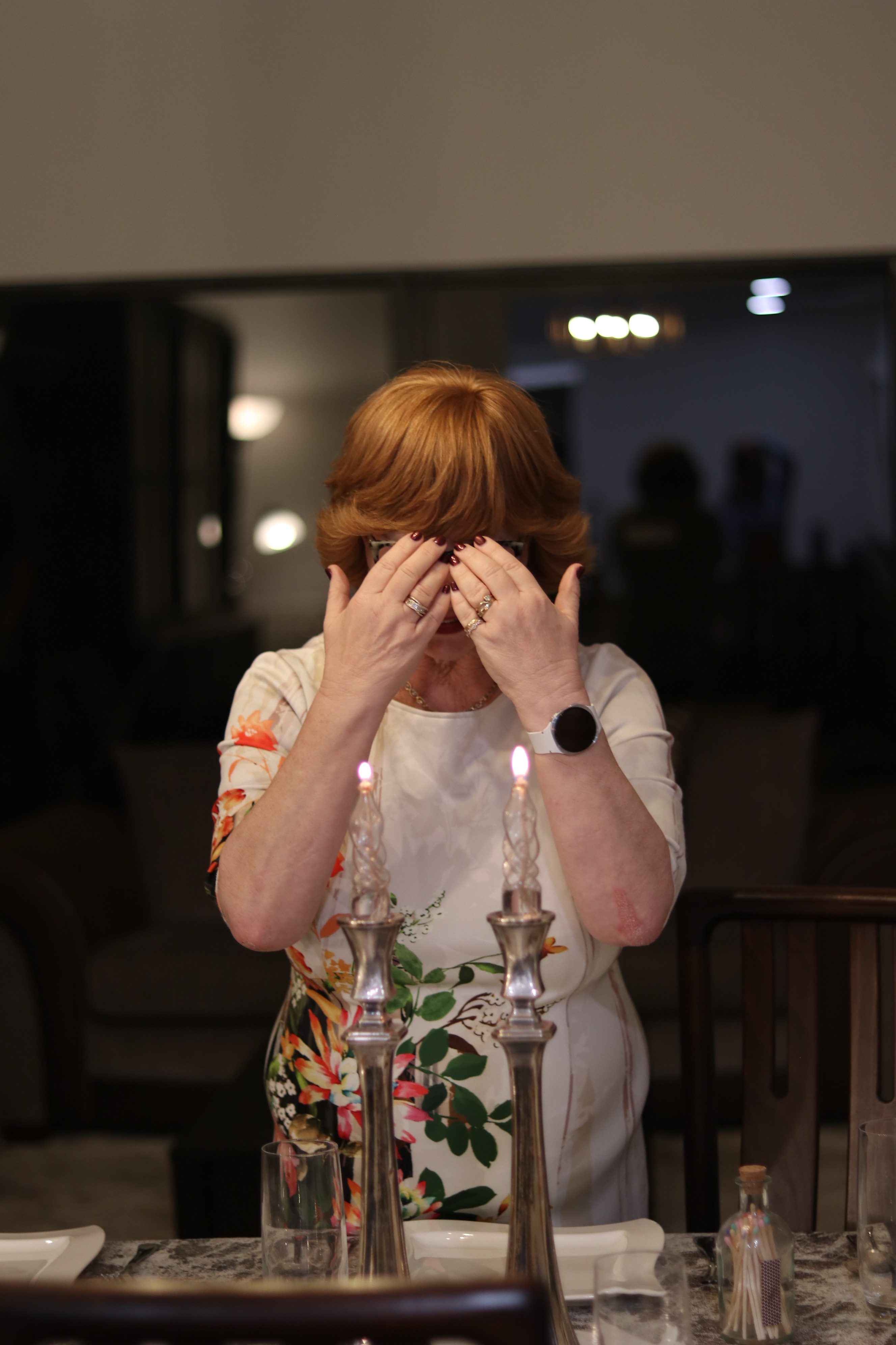 Tags: candle, ceremony, closed eyes, covering eyes, culture, dining, elderly, family tradition, Grandmother, lighting, praying, preparing, religious, table setting, Woman