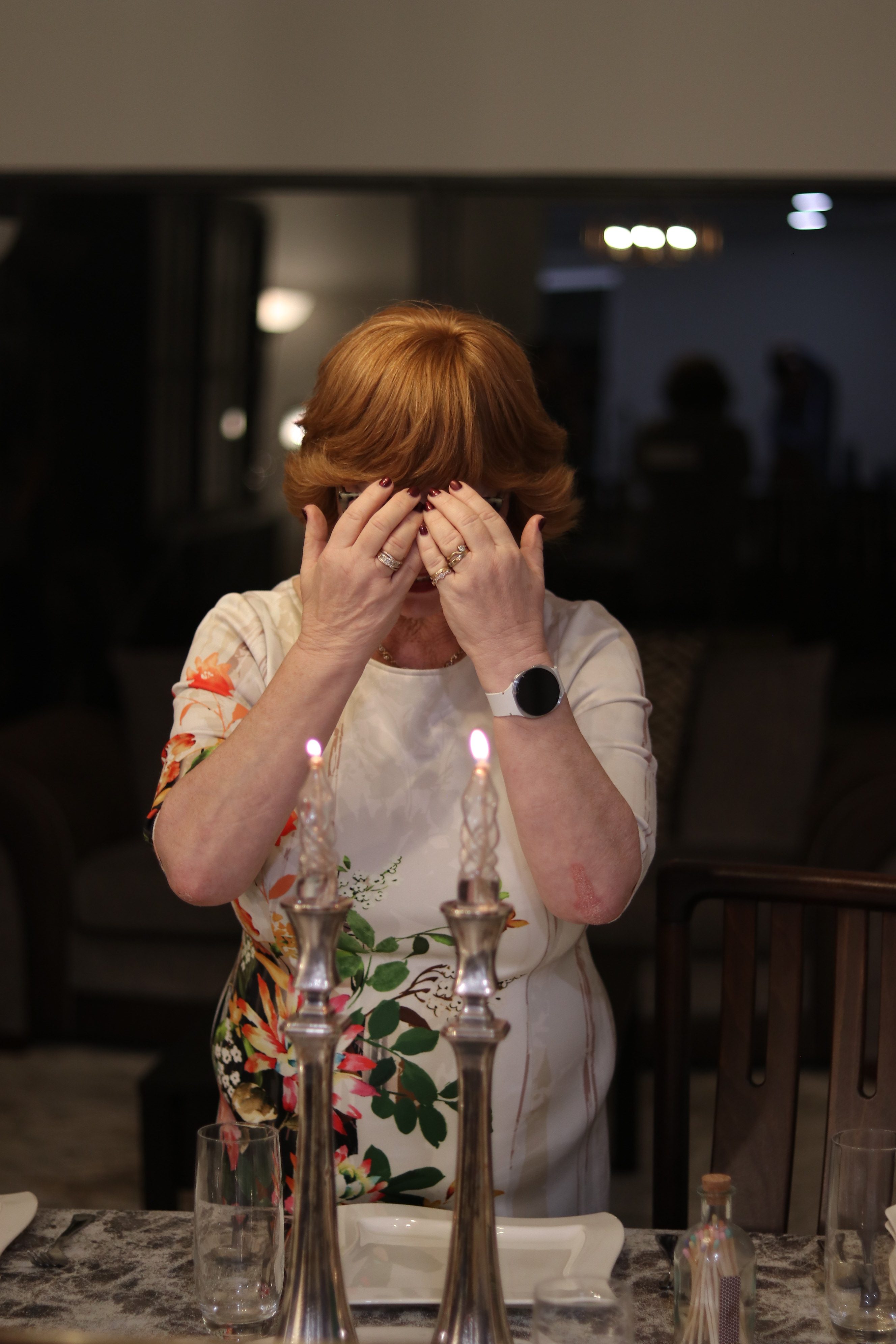 Tags: candle, ceremony, closed eyes, covering eyes, culture, dining, elderly, family tradition, Grandmother, happy, lighting, praying, preparing, religious, table setting, Woman