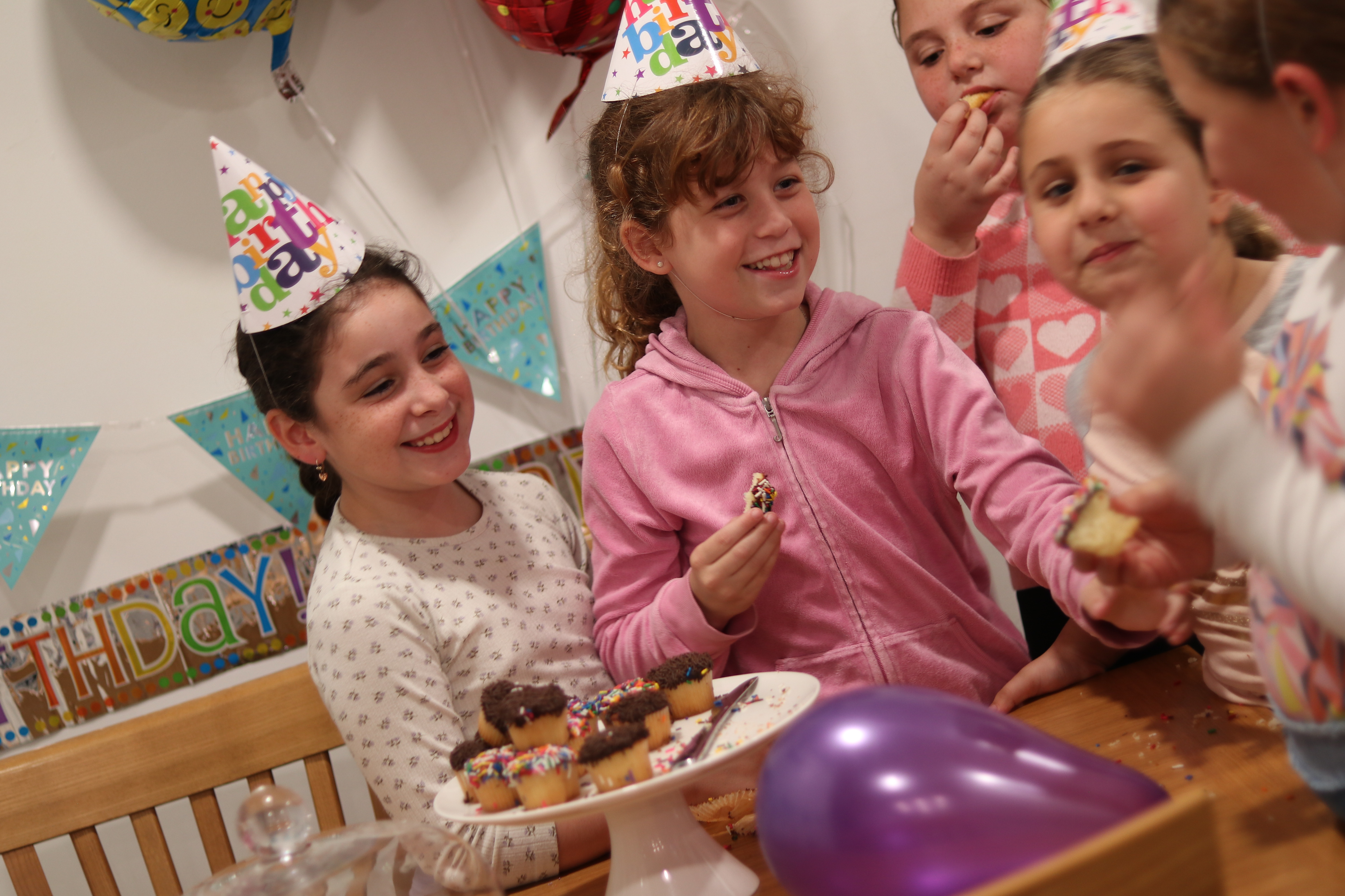 Group of Young Girls Celebrating a Birthday with Cupcakes and Party Hats Indoors