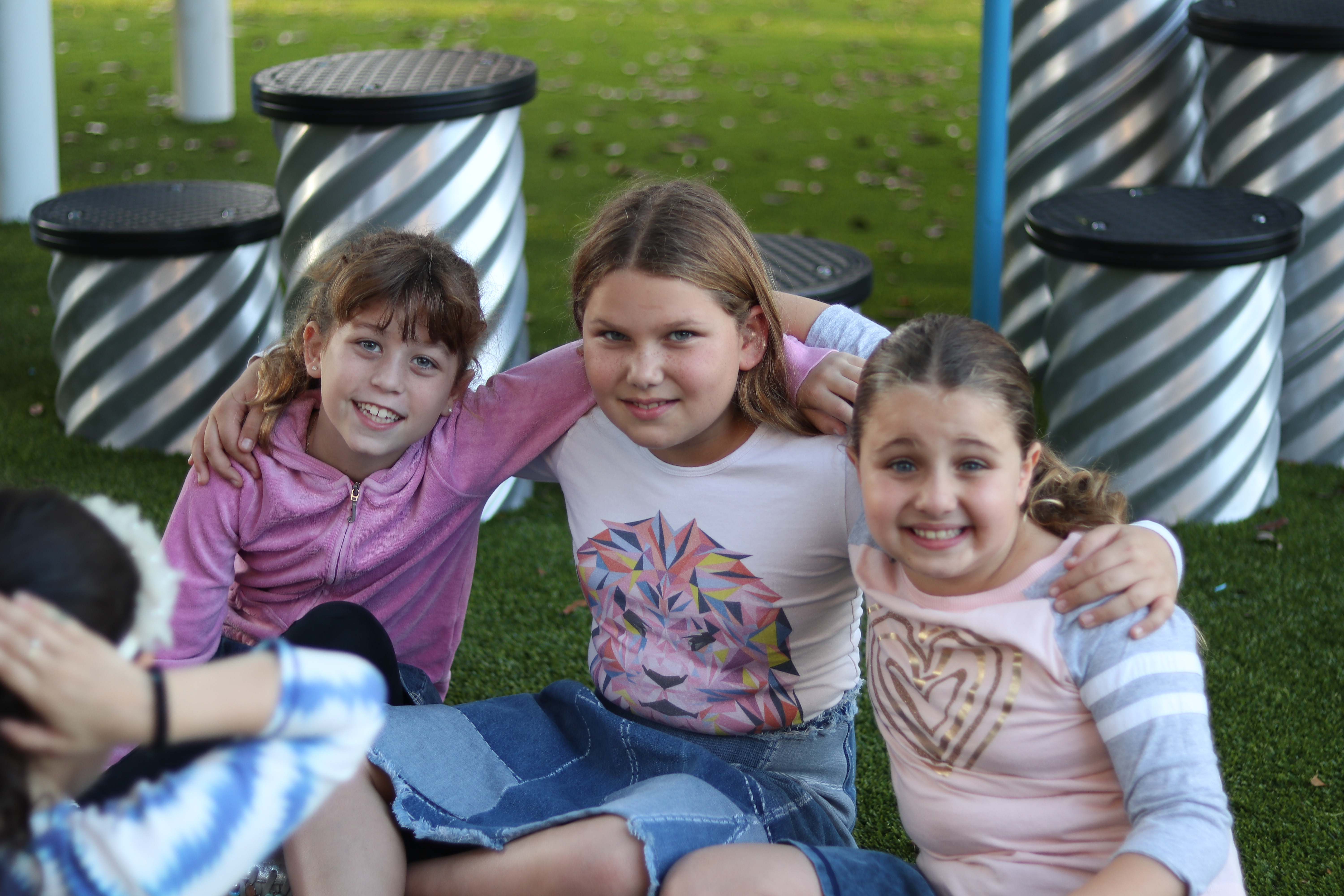 Happy Girls Smiling and Sitting on Grass Together in a Park Playground