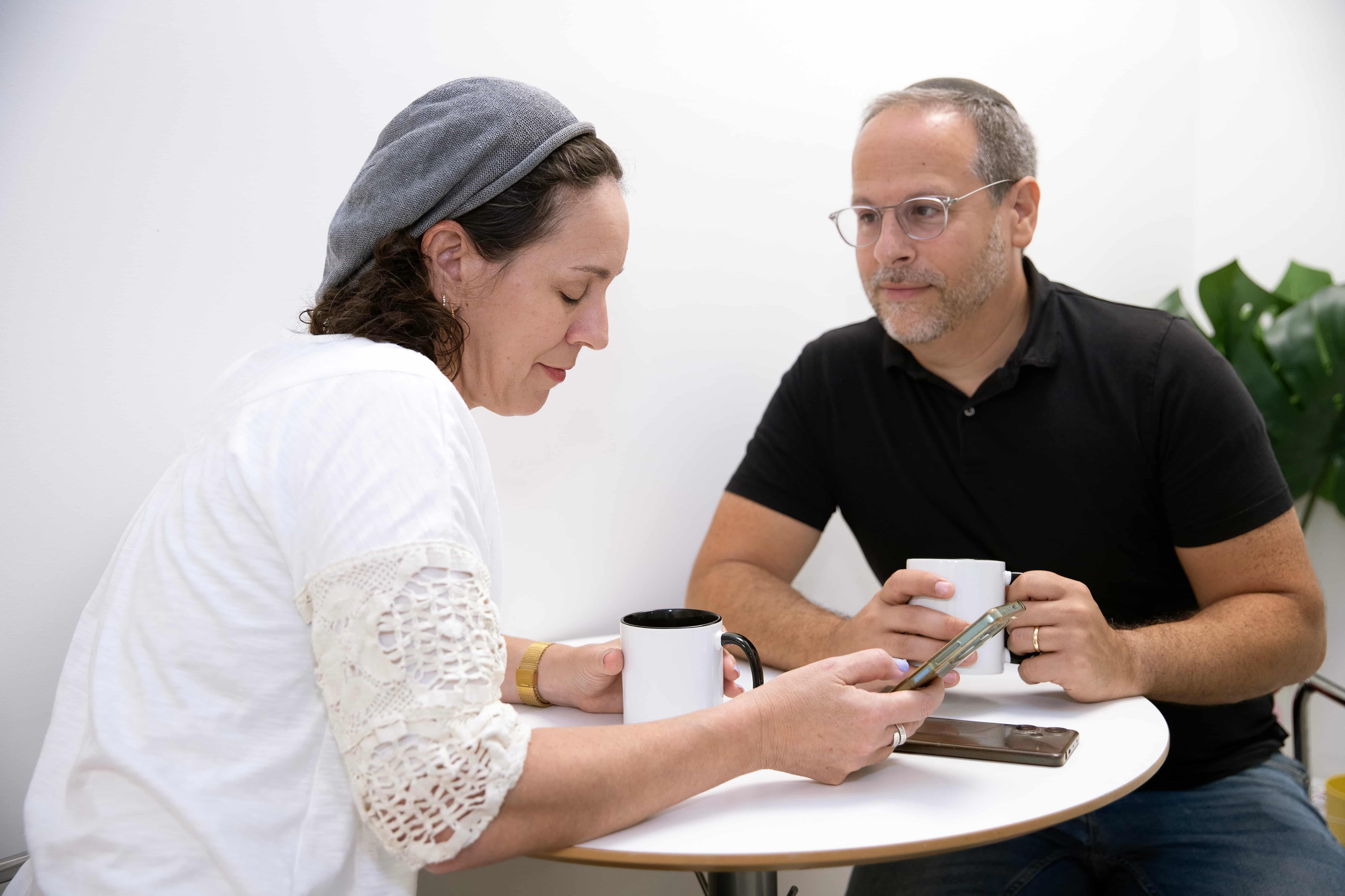 Man and Woman Smiling and Using Smartphones While Sitting Together