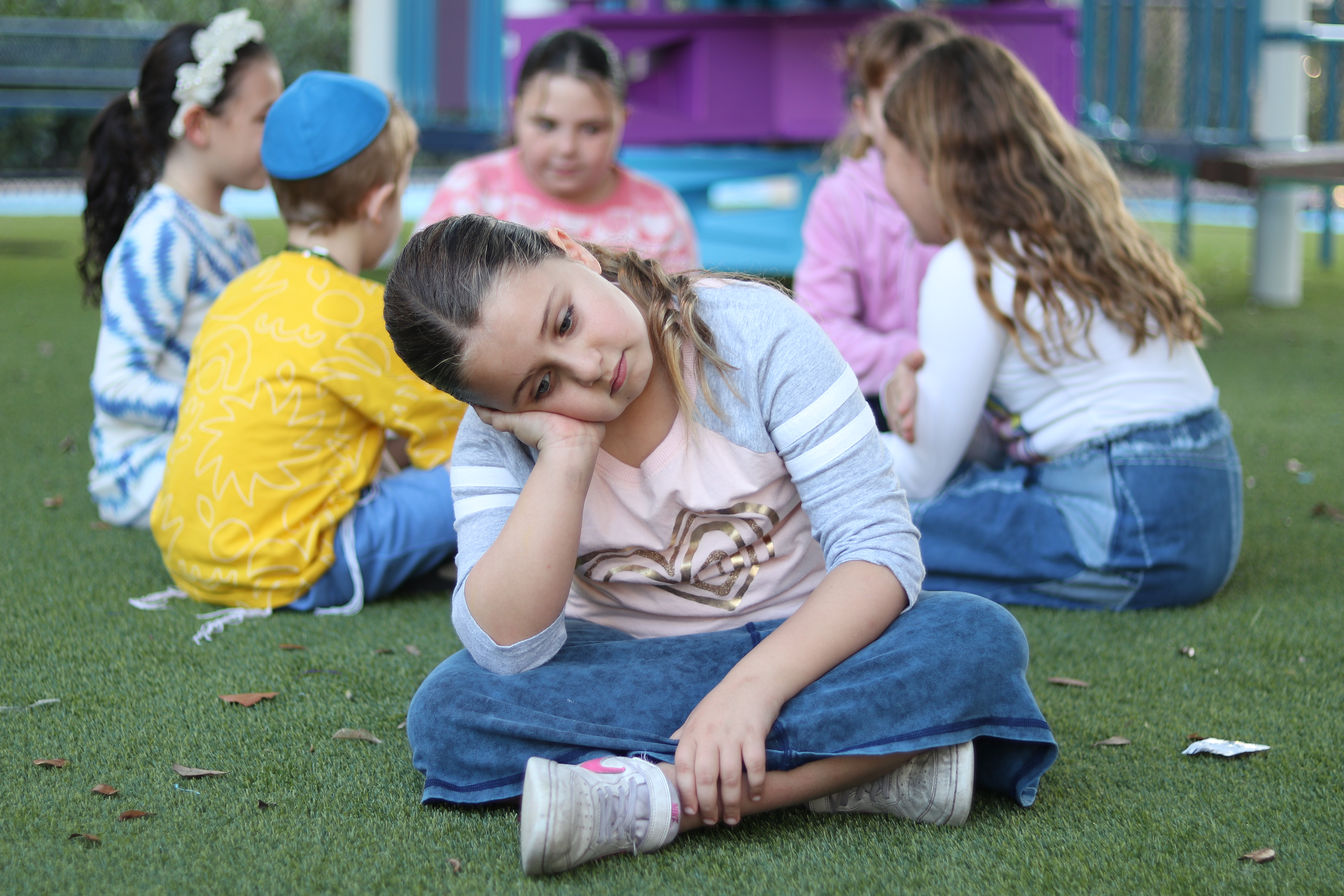 Sad Young Girl Sitting Alone on Grass While Other Children Play in Background