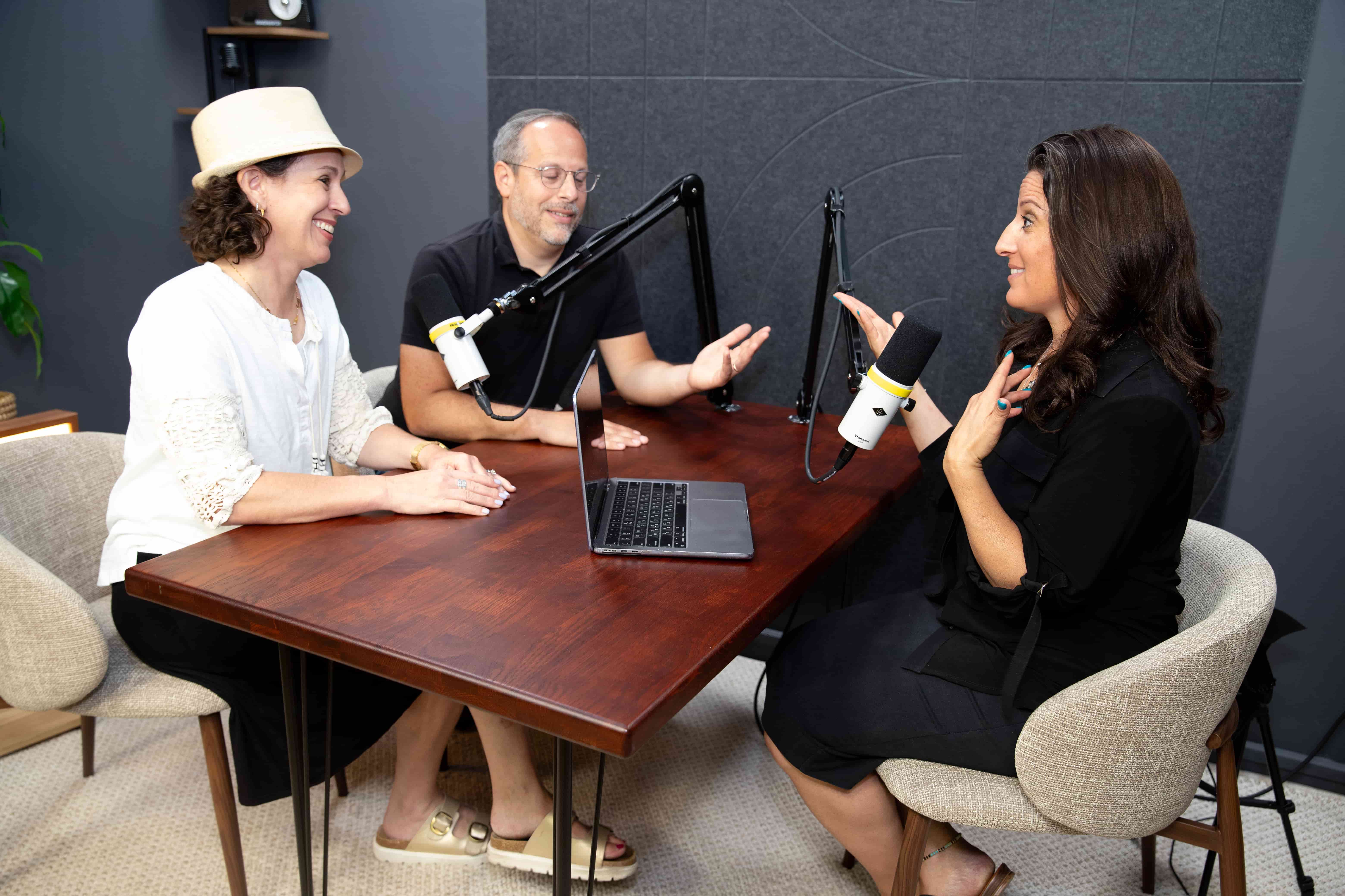 Two Women and a Man Sharing Personal Stories During Podcast Recording