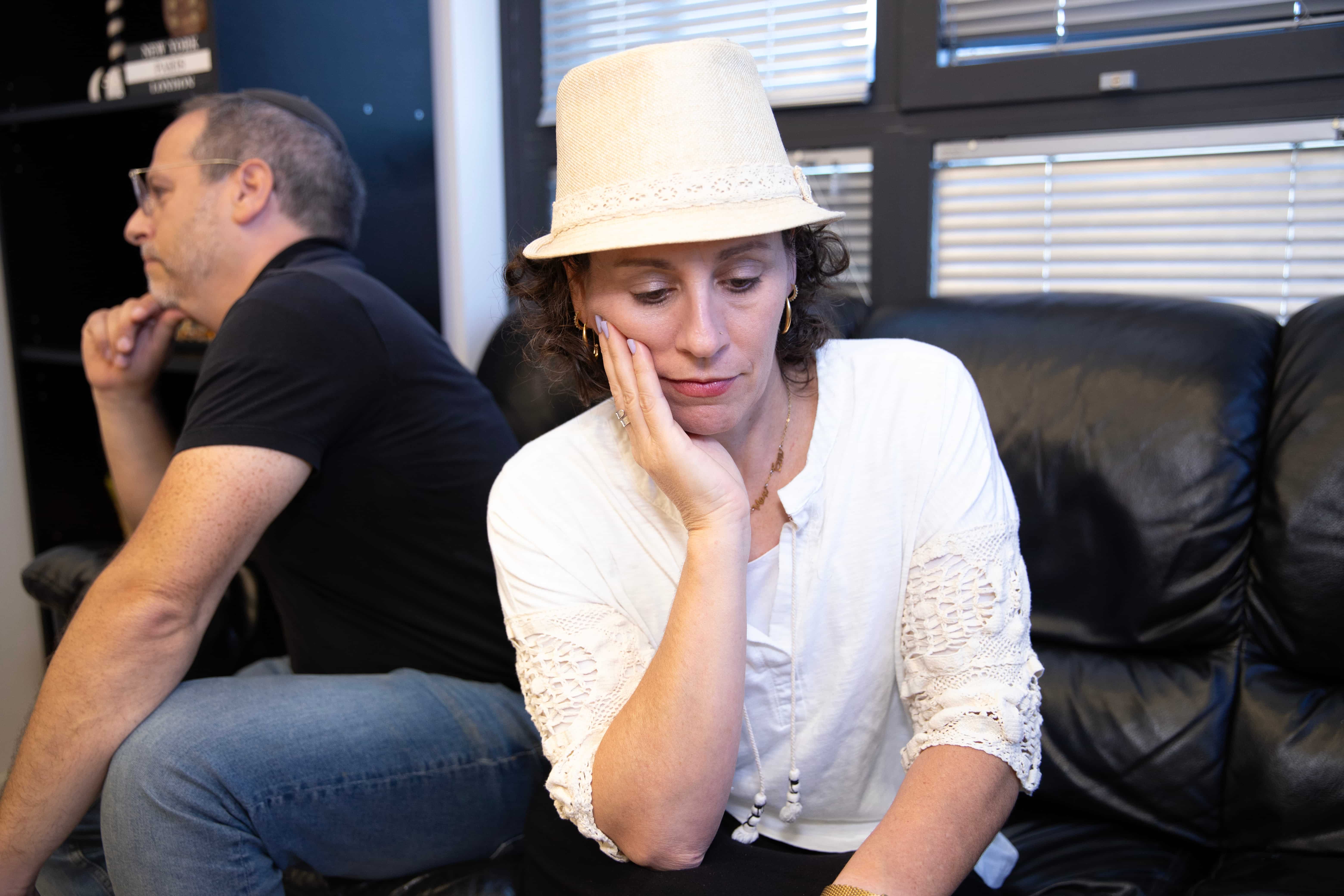 Worried Woman Resting Face on Hand, Man Sitting in Background