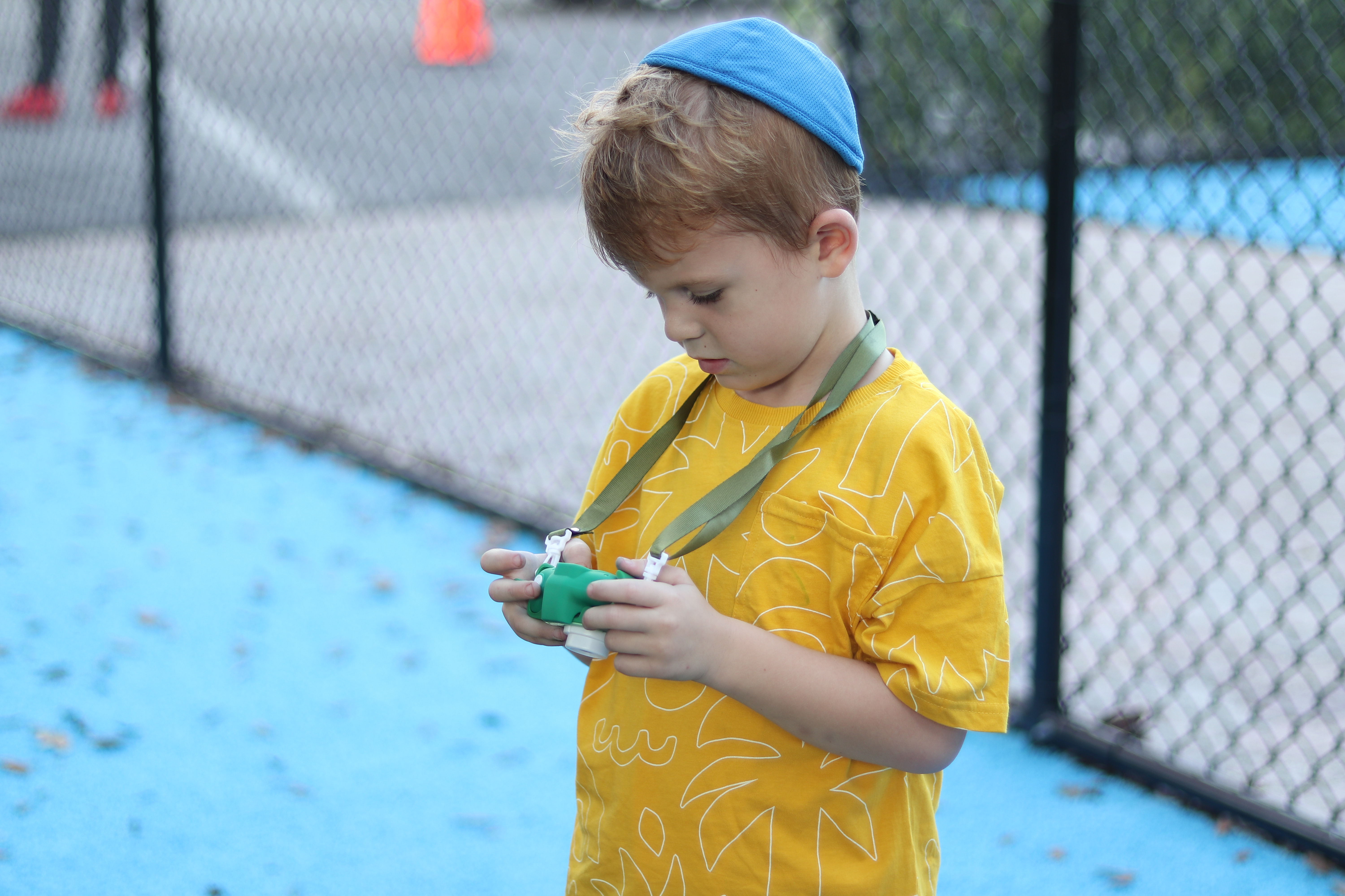 Young Boy Holding a Toy Near an Outdoor Play Area