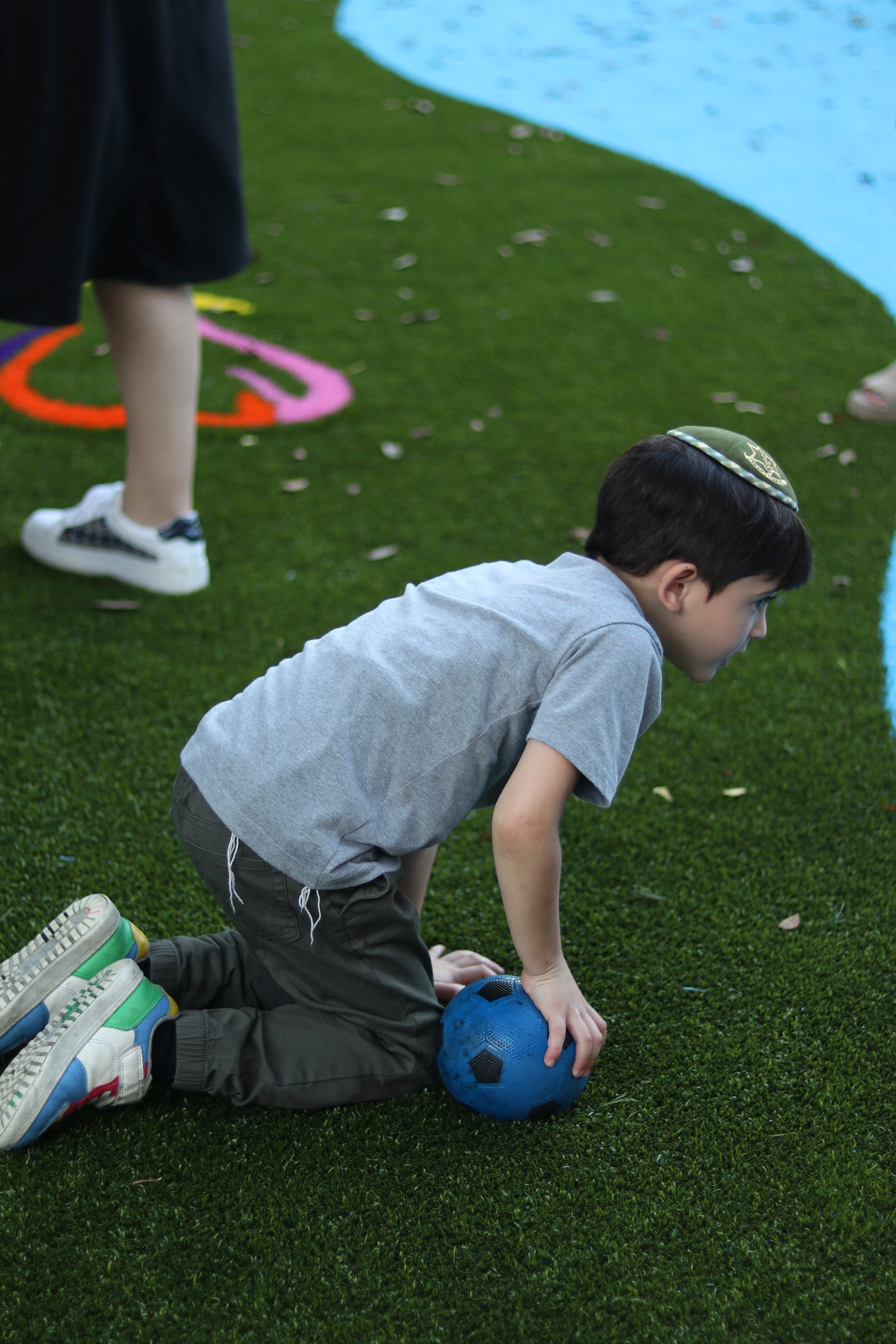 Young Boy Kneeling on Grass and Holding a Ball at a Playground